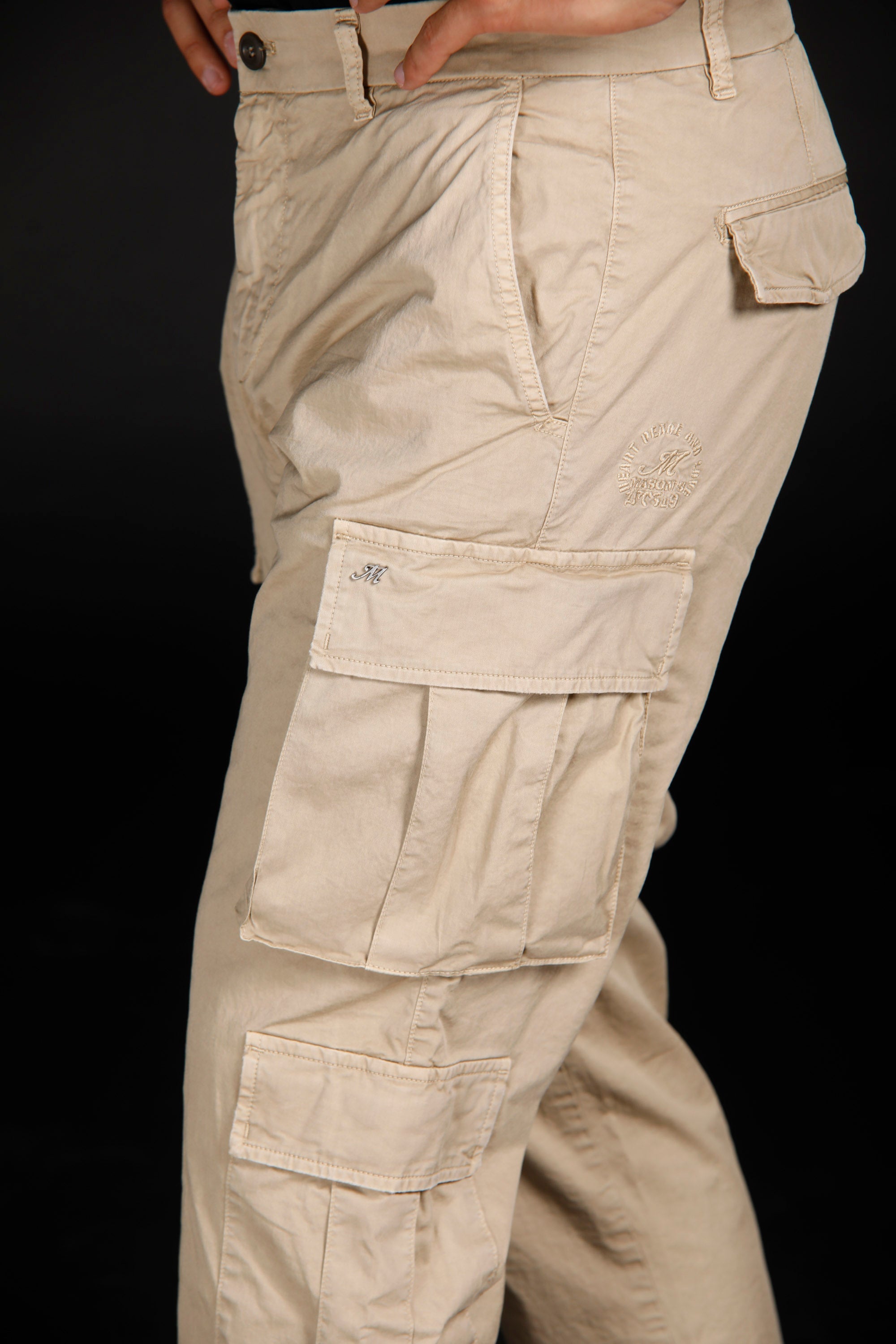 Този карго панталон е градската еволюция на класическите панталони на американската армия с двоен страничен джоб на бедрото и се отличава с характеристики на абсолютна идентичност като бродерията с логото на Mason's, кръглите шевове на гърба и металния символ "M" на левия джоб.